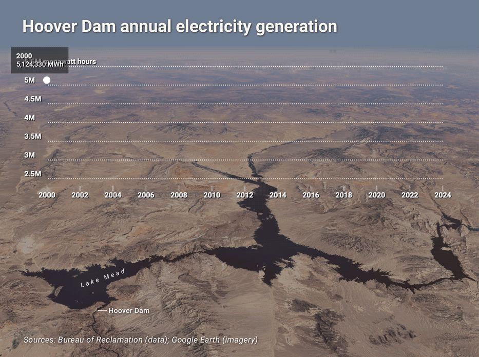 Since the turn of this century, Hoover’s electrical output has dropped in tandem with Lake Mead’s decline. Annual generation is down by about half since 2000, the last year the reservoir was full.