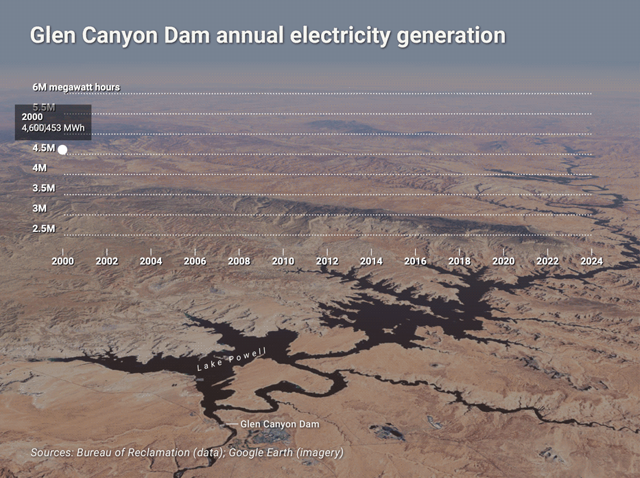 Glen Canyon Dam, the other big hydropower asset in the basin, is also in trouble. According to Reclamation, hydropower there will cease when Lake Powell falls below elevation 3,490 feet. The latest Reclamation projections indicate a 10% chance of that happening by September 2026. The agency is considering its options for the low-water scenario, but not publicly saying much more.