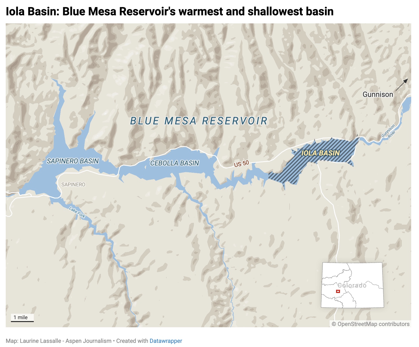 Formed by damming the Gunnison River, Blue Mesa Reservoir is Colorado’s largest reservoir, with a capacity of about 940,000 acre-feet. Three separate basins make up the reservoir: Sapinero, Cebolla and Iola. Iola is the farthest upstream, the warmest and shallowest — and also the most likely to have toxic algal blooms.