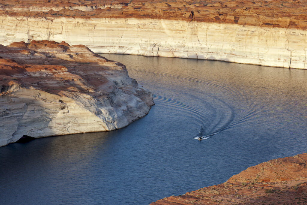 Lake Powell is formed by Glen Canyon Dam, a striking 710-ft tall concrete arch braced against ruddy sandstone walls. It plugs the Colorado just after the river enters Arizona. Meant to ensure water deliveries to the lower basin states of Arizona, California, and Nevada, Glen Canyon Dam was finished in 1963 to complement the Colorado River’s audacious engineering that distributes water through mountains and uphill to the largest cities in the Southwest and to the region’s most productive farmland. When full, Lake Powell holds enough water to flood the entire state of Virginia to the depth of one foot.